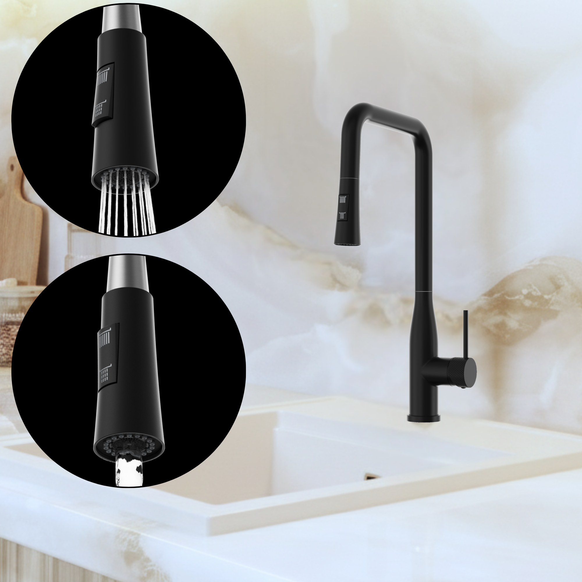 Kolor czarny wyróżnia się subtelnym, matowym odcieniem, który nadaje baterii elegancki i ponadczasowy charakter. To wykończenie jest odporne na odciski palców i świetnie komponuje się zarówno z jasnymi, jak i ciemnymi aranżacjami kuchni.
