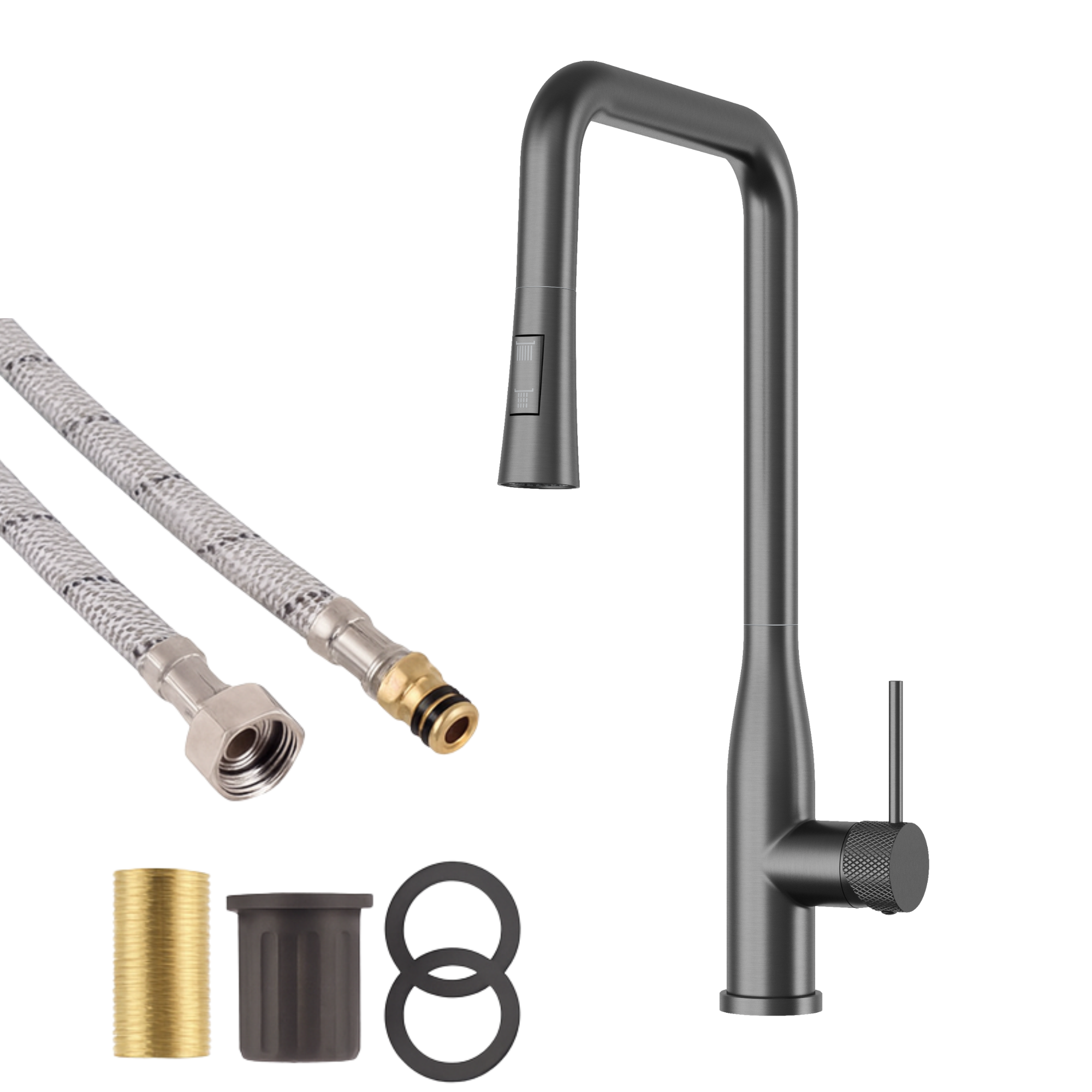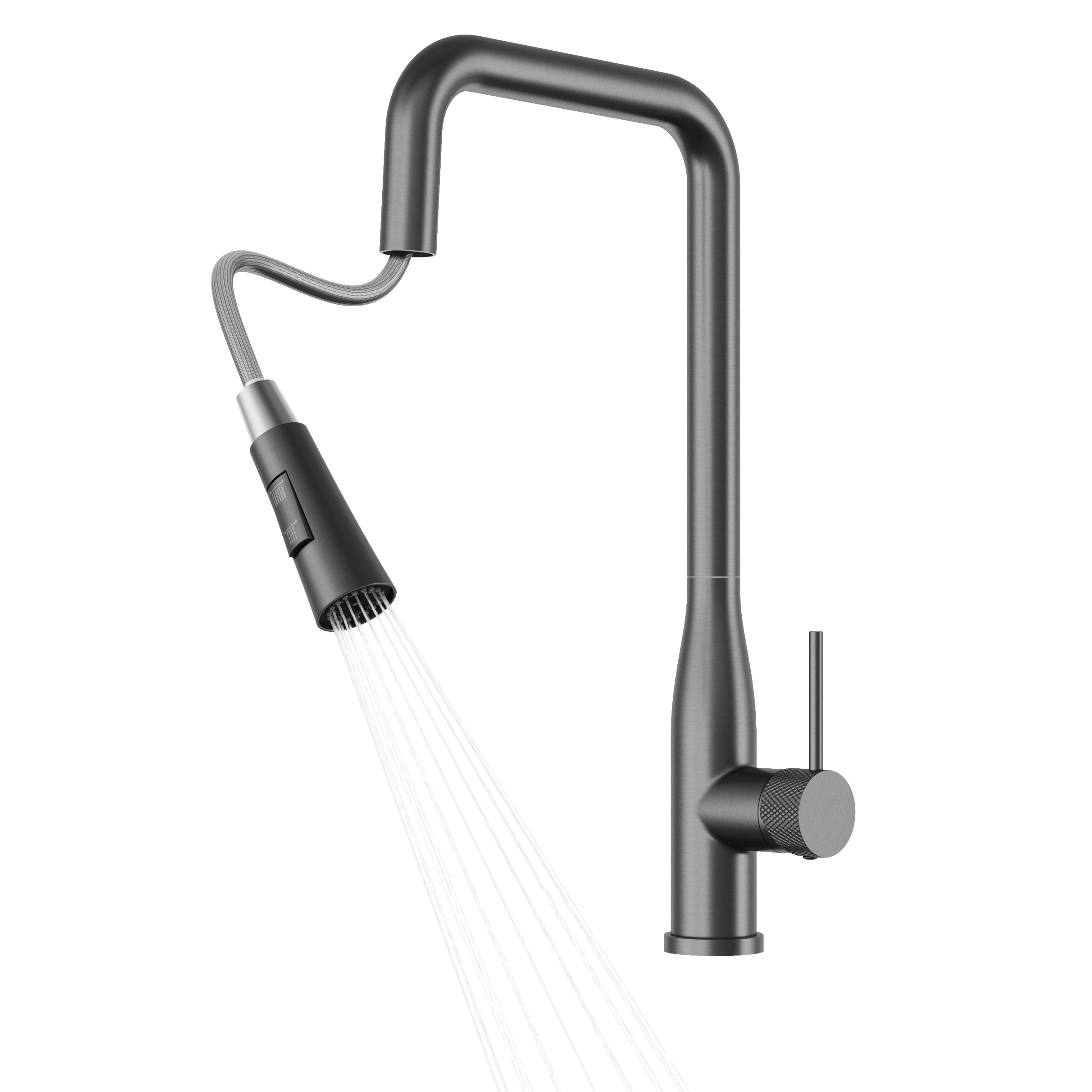 Bateria kuchenna VECTOR w kolorze gungrey wyróżnia się eleganckim, nowoczesnym designem oraz wysoką funkcjonalnością. Model wyposażony jest w praktyczną, wyciąganą wylewkę, która ułatwia płukanie naczyń, mycie komory zlewu oraz napełnianie większych garnków.