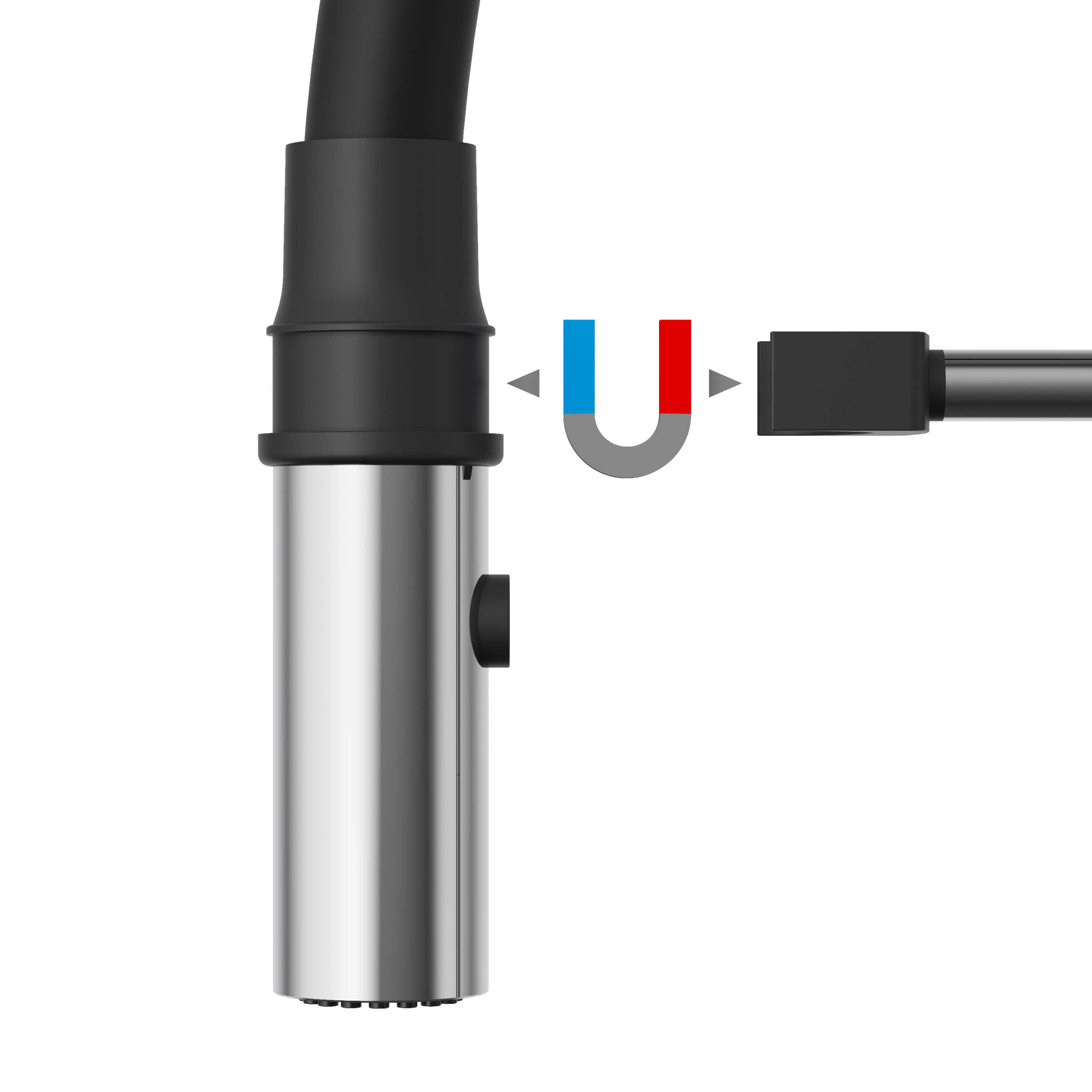 Wbudowany magnes precyzyjnie przyciąga końcówkę wylewki, zapewniając jej automatyczny i stabilny powrót na miejsce po każdym użyciu. Elastyczna konstrukcja umożliwia swobodne manewrowanie strumieniem wody, takie rozwiązanie zapobiega zwisaniu węża i wydłuża trwałość baterii, czyniąc ją praktycznym wyborem do codziennego użytkowania.