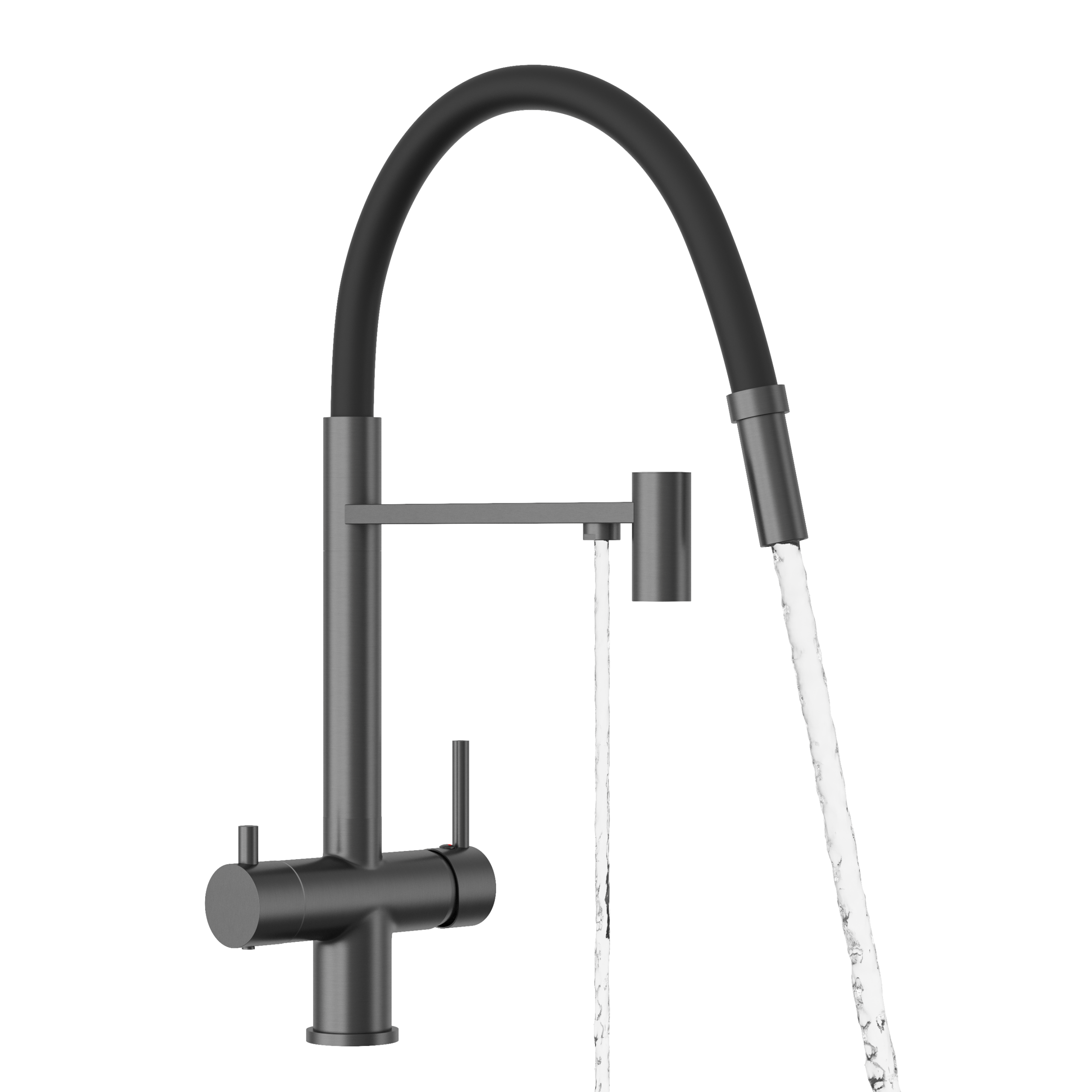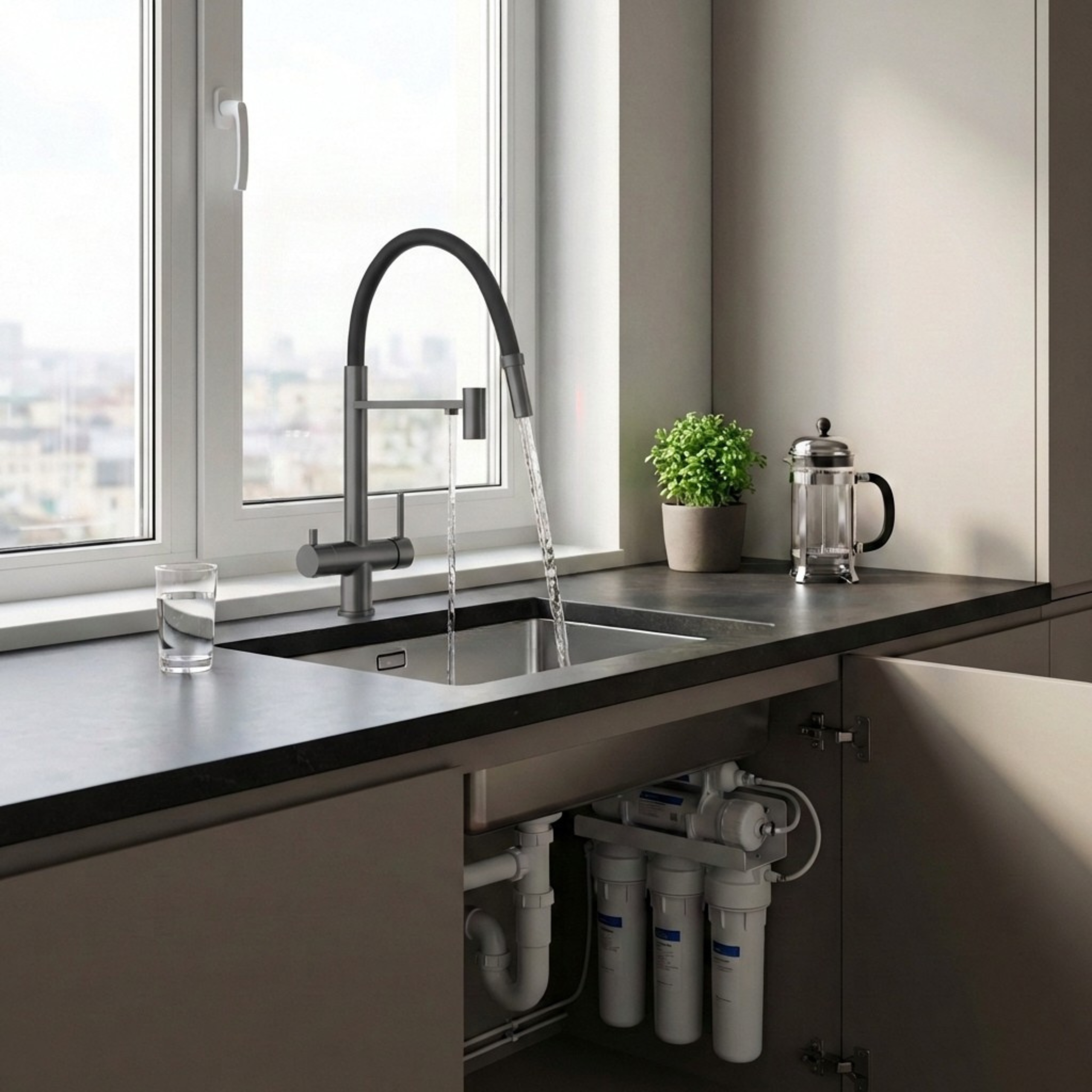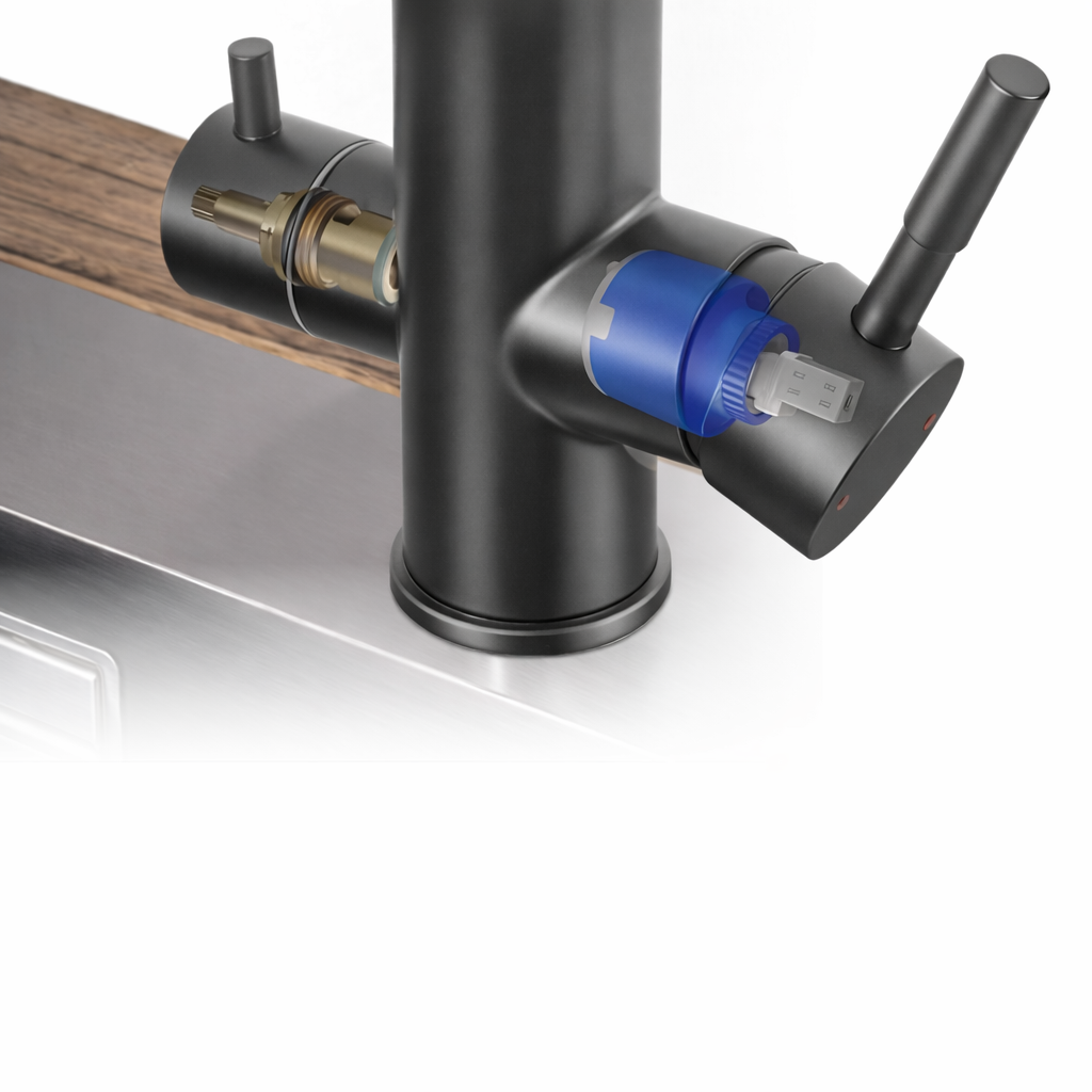 Jedna bateria zamiast dwóch to czystszy, nowoczesny wygląd strefy zlewu oraz więcej wolnej przestrzeni. Dzięki oddzielnym kanałom woda do filtracji nie miesza się z wodą użytkową, a obsługa pozostaje szybka i intuicyjna. Wszystko masz pod ręką – bez dodatkowych kraników, przełączników i zbędnych elementów.
