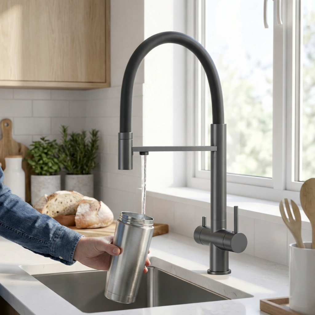 Ta bateria kuchenna trójdrożna to nowoczesne i praktyczne rozwiązanie do każdej kuchni. Umożliwia podłączenie wody zimnej, ciepłej oraz filtrowanej w jednym kranie, dzięki czemu nie potrzebujesz dodatkowej wylewki – maksymalna oszczędność miejsca na zlewie i estetyczny wygląd blatu.