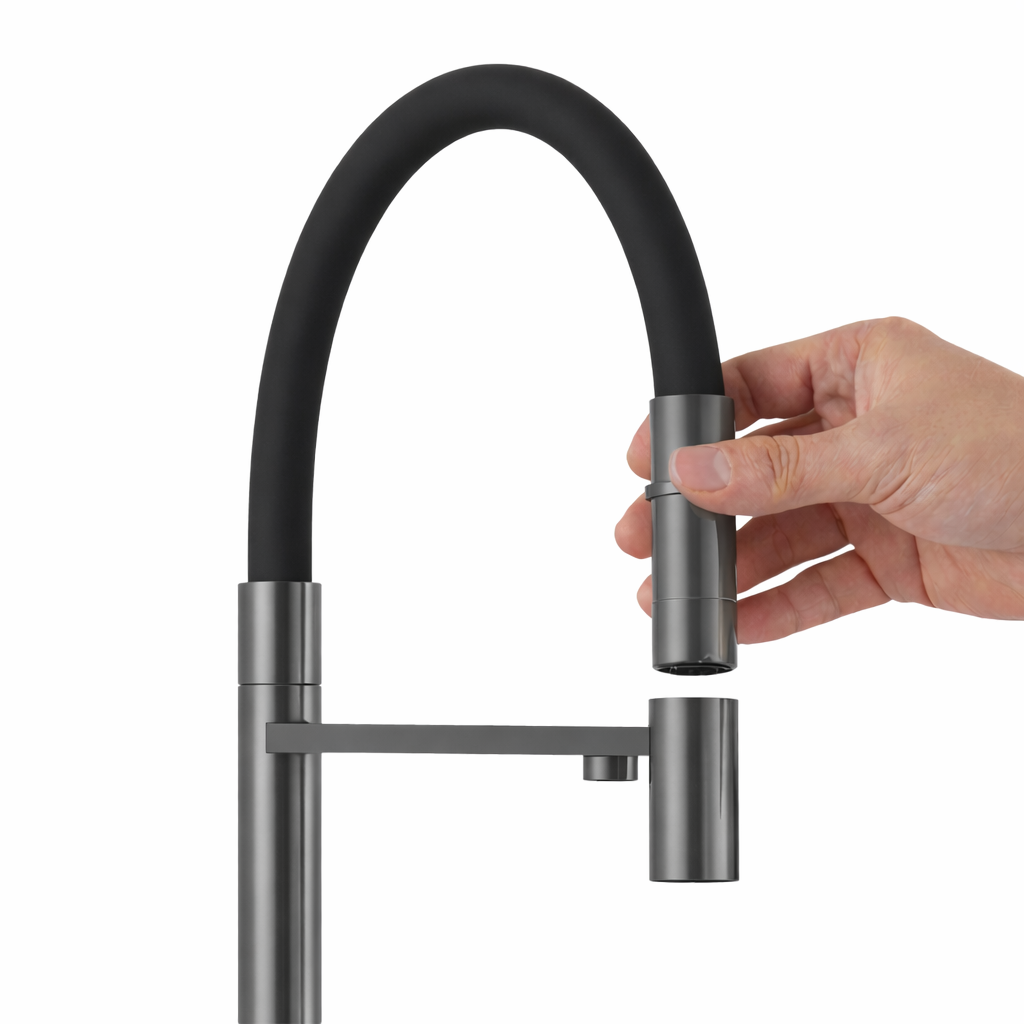 Wyjmowana końcówka w połączeniu z elastyczną konstrukcją wylewki zapewnia wysoki komfort pracy przy zlewie oraz ułatwia utrzymanie czystości bez użycia dodatkowych akcesoriów. Zastosowana w baterii giętka, elastyczna wylewka umożliwia swobodne kierowanie strumieniem wody, co znacząco ułatwia mycie naczyń oraz czyszczenie zlewu. Wysoka konstrukcja zwiększa komfort pracy, szczególnie przy większych garnkach i blachach.