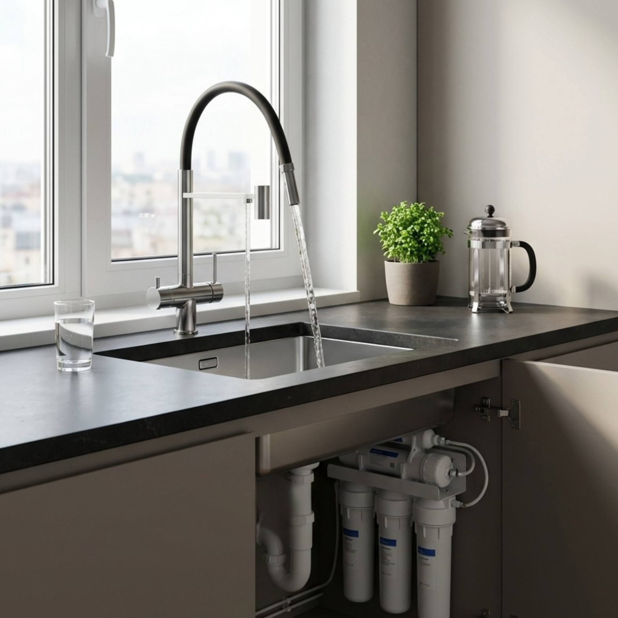 Nowoczesny zestaw składający się z eleganckiej chromowanej baterii kuchennej trójdrożnej oraz systemu filtracji wody montowanego pod zlewem. Bateria umożliwia korzystanie z wody ciepłej, zimnej oraz przefiltrowanej – wszystko z jednego kranu, bez potrzeby instalowania osobnej wylewki. Filtr, zamontowany w szafce pod zlewem, składa się z trzech stopni oczyszczania, zapewniając czystą i smaczną wodę prosto z sieci wodociągowej.