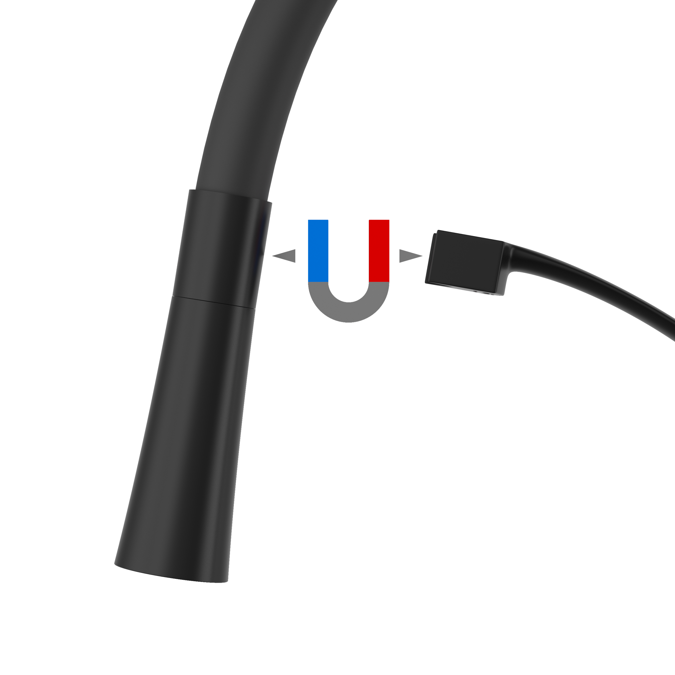Zapewnia wygodne i dokładne odkładanie wylewki po zakończeniu użytkowania. Wbudowany magnes sprawia, że końcówka natrysku samoczynnie wraca na swoje miejsce, bez potrzeby poprawiania jej ręką. To rozwiązanie dba o schludny wygląd baterii i porządek w strefie zlewu