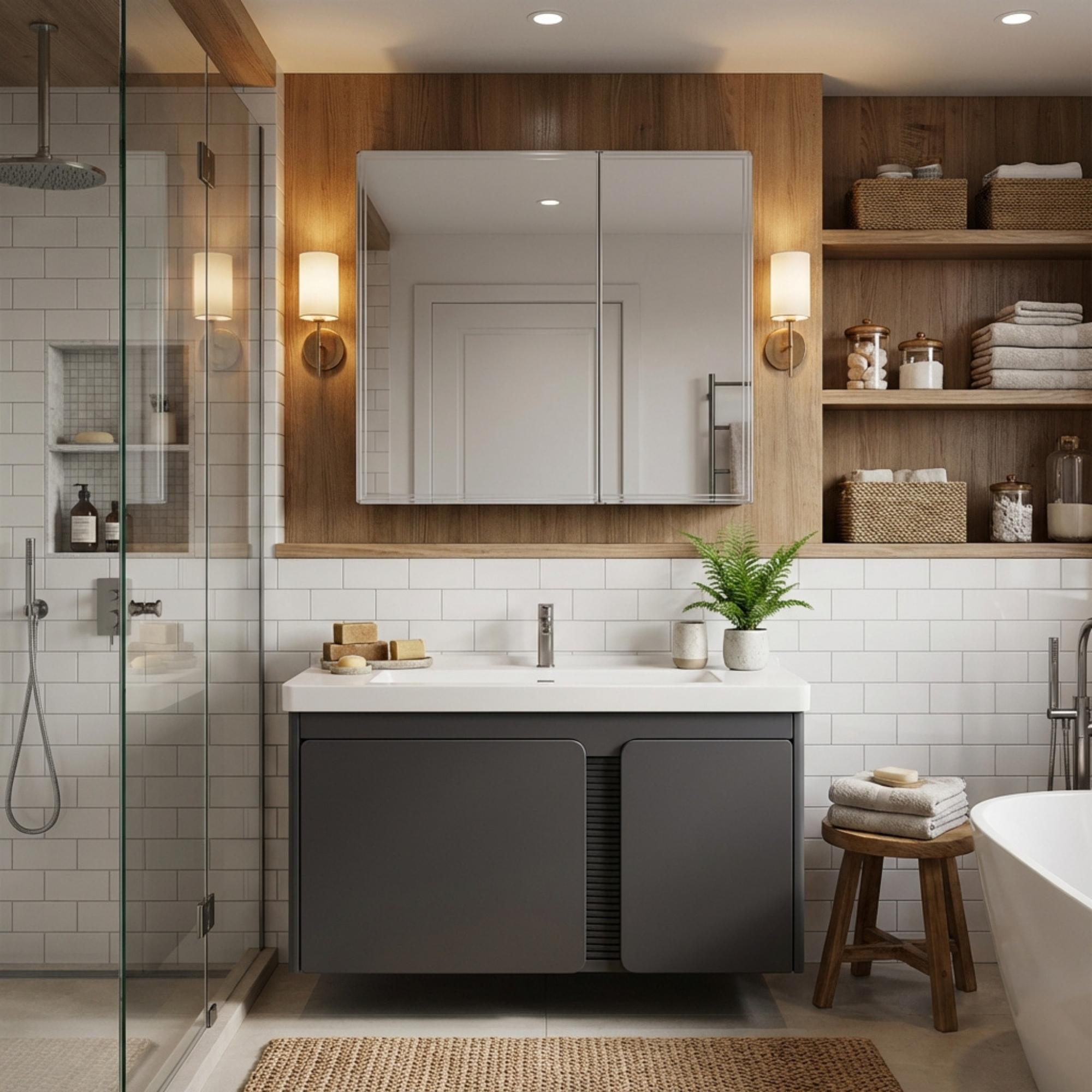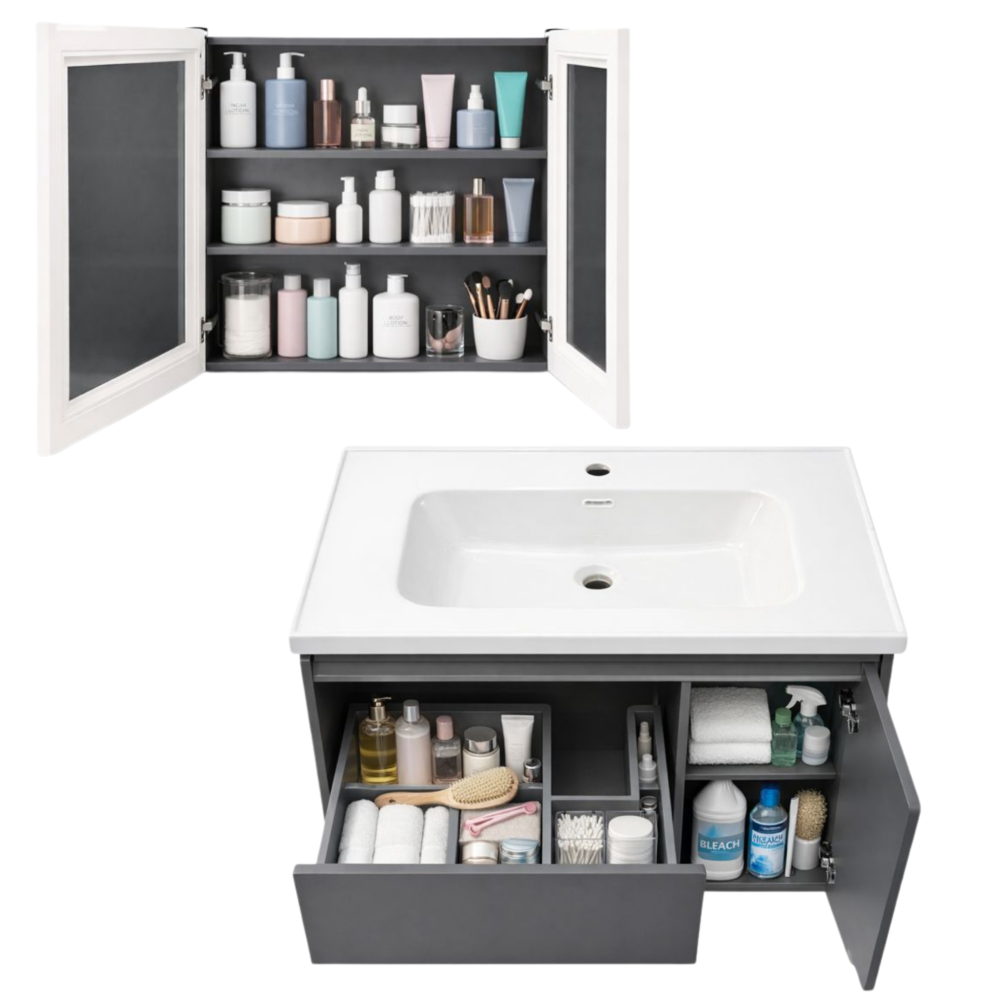 System obejmujący pojemną szufladę oraz boczną szafkę witrynową idealną na kosmetyki i przybory toaletowe. Układ ten pozwala utrzymać idealny porządek nawet w mniejszych łazienkach.