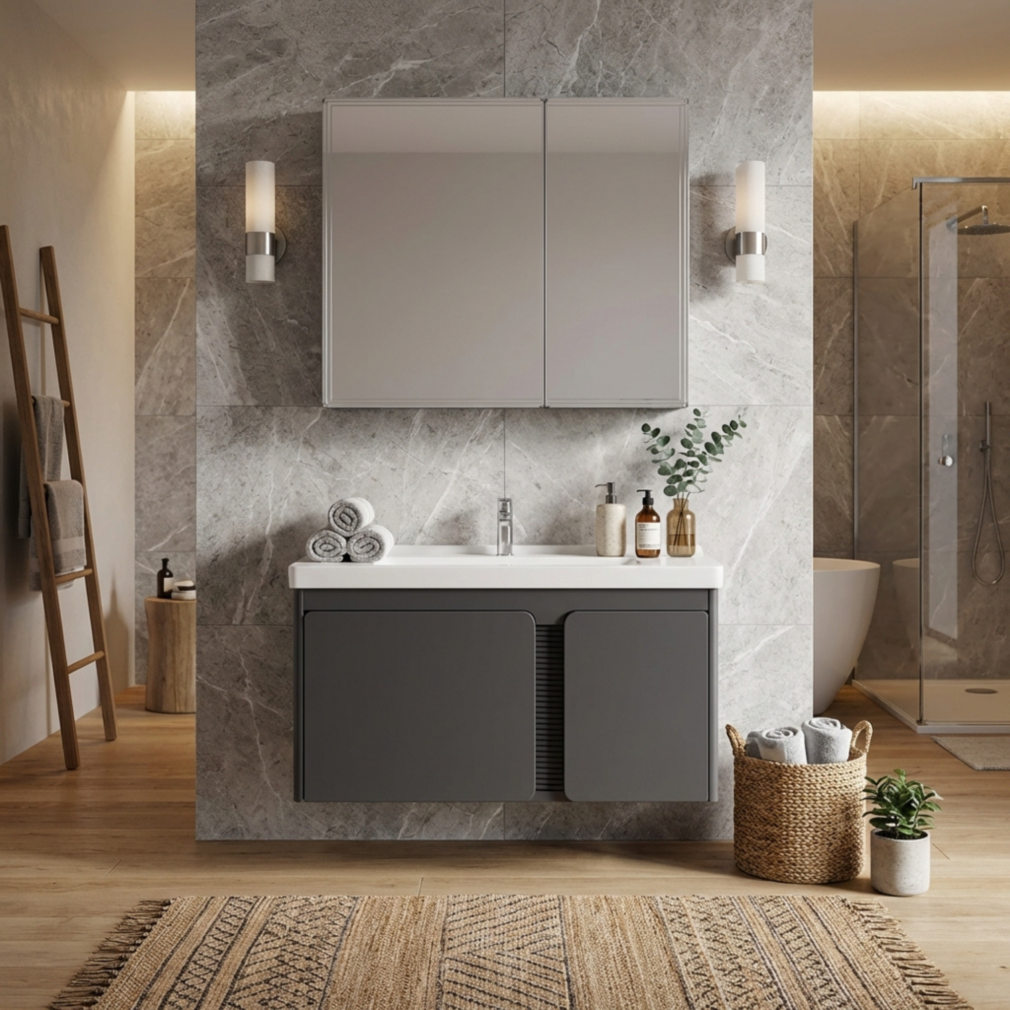 Wszystkie elementy zostały zaprojektowane tak, aby idealnie do siebie pasowały – zarówno pod względem estetyki, jak i funkcjonalności. Zestaw umożliwia skompletowanie wyposażenia łazienki w jednym miejscu, bez ryzyka niedopasowania poszczególnych elementów.