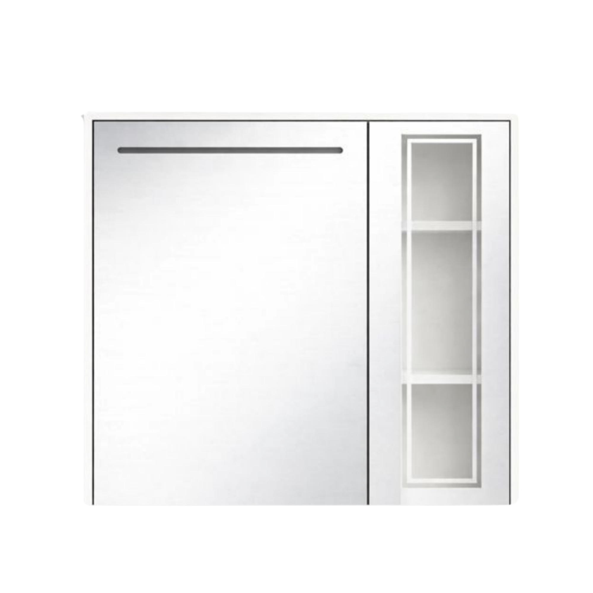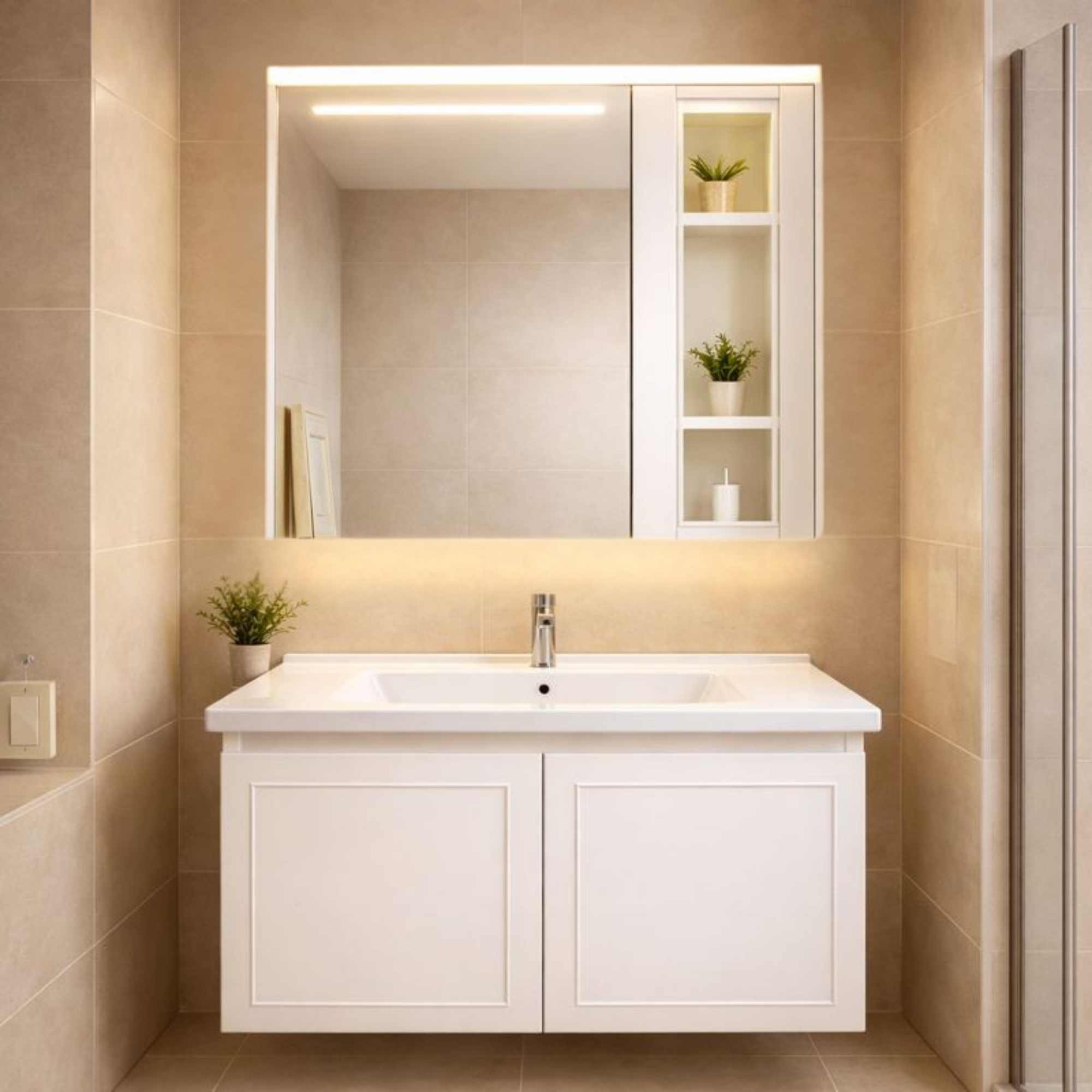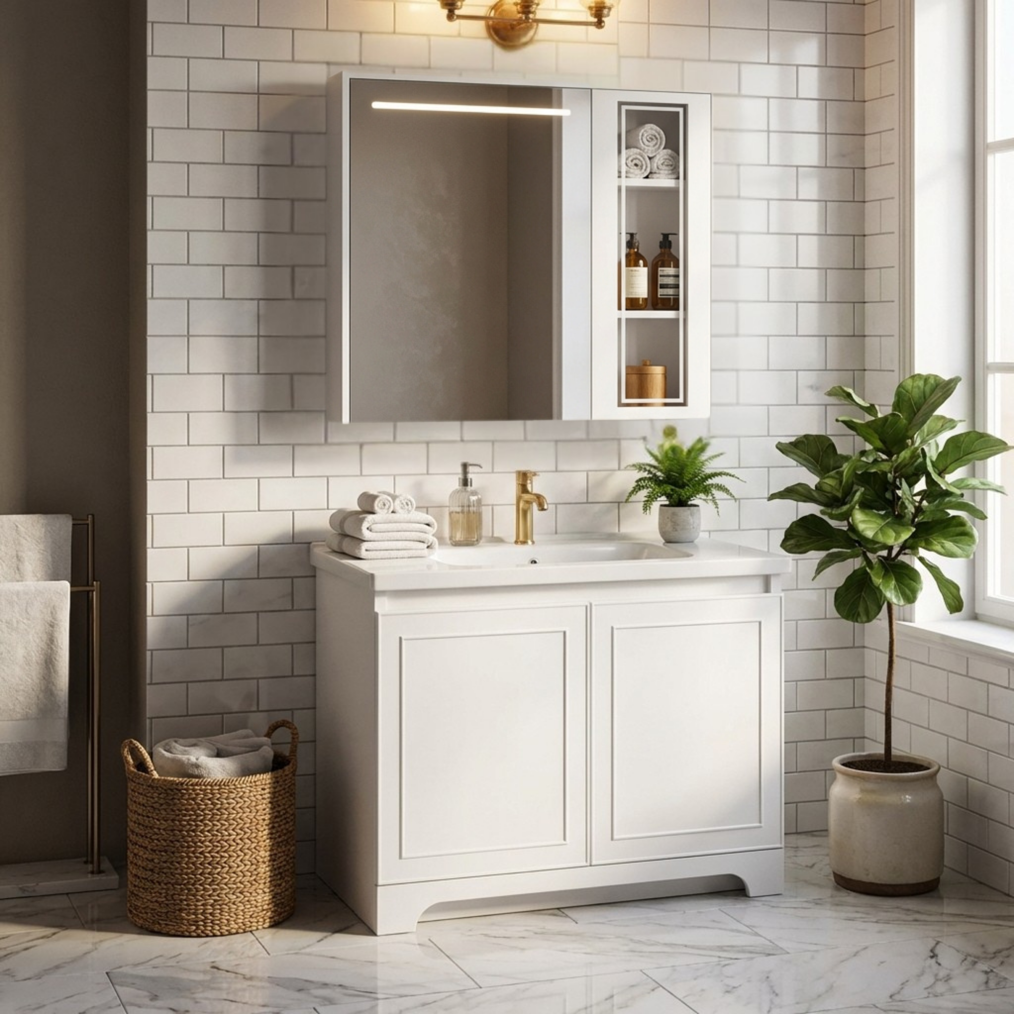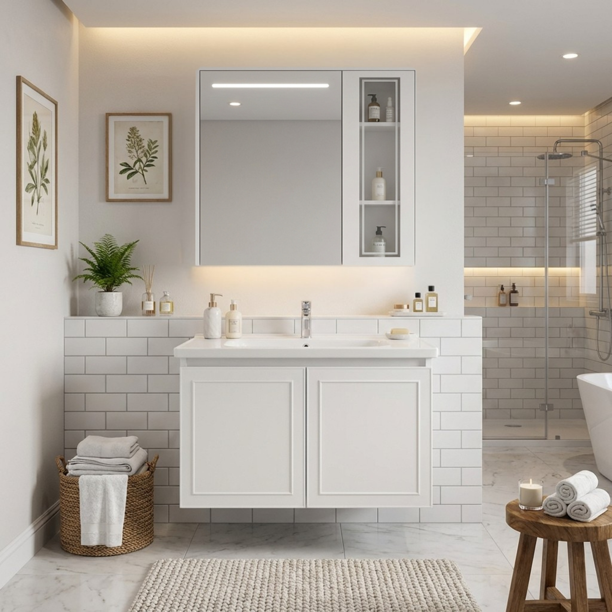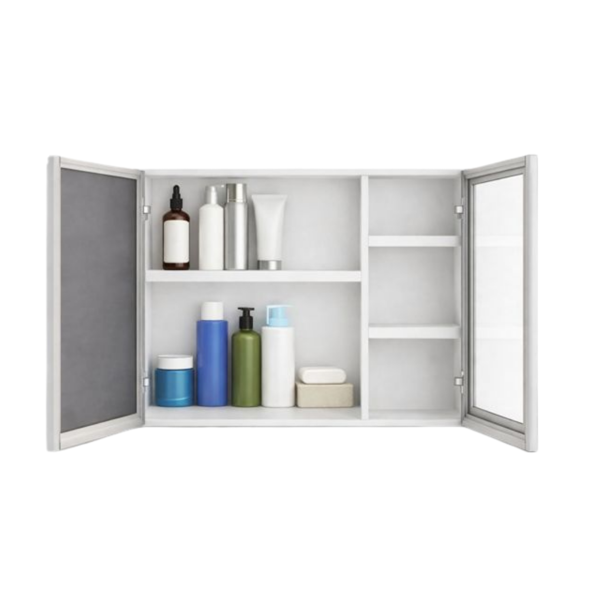 Funkcjonalna szafka łazienkowa z lustrem, zaprojektowana z myślą o wygodzie i estetyce. Szafka otwiera się i posiada 3 pojemne półki, idealne do przechowywania kosmetyków i akcesoriów.