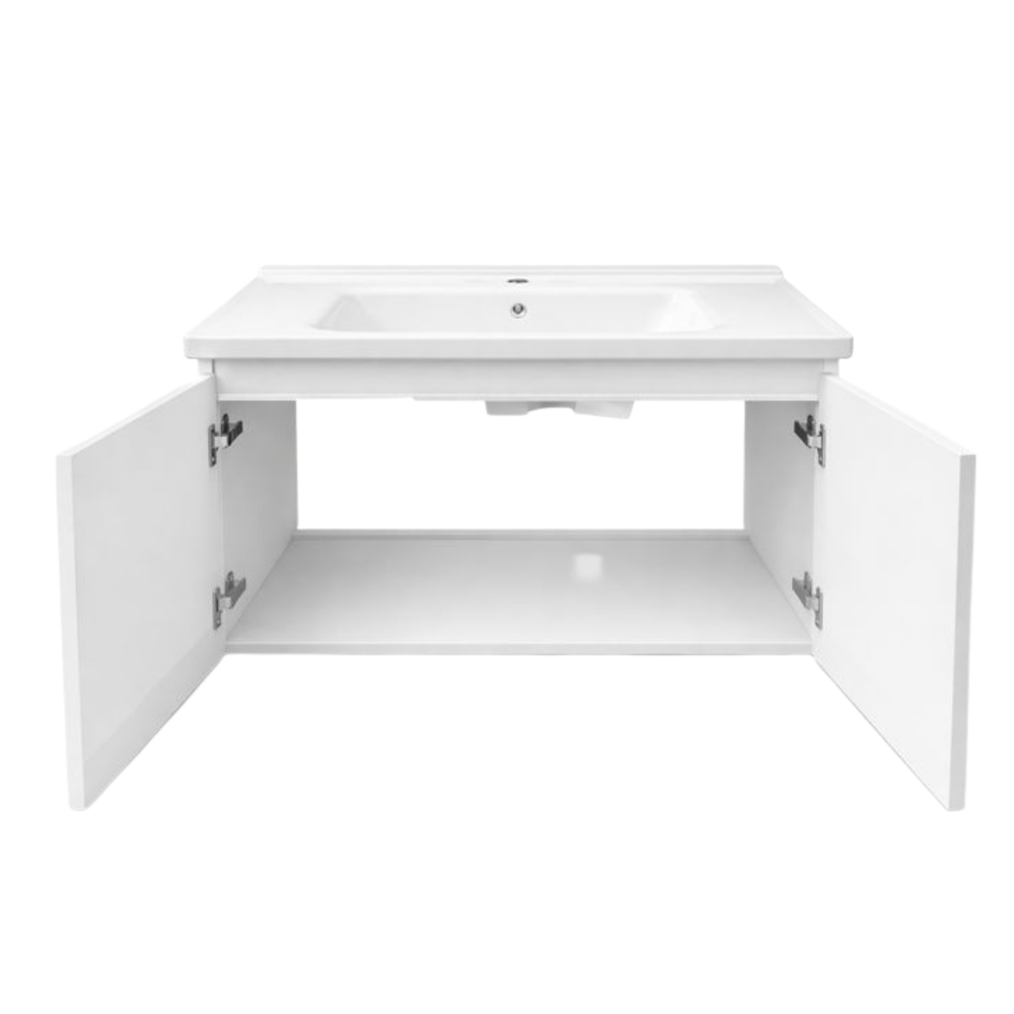 Wewnętrzne półki szafek, oferują dużo miejsca do przechowywania kosmetyków, środków higienicznych i akcesoriów łazienkowych. Funkcjonalny układ wnętrza ułatwia organizację i wygodny dostęp do wszystkiego, co potrzebne na co dzień.