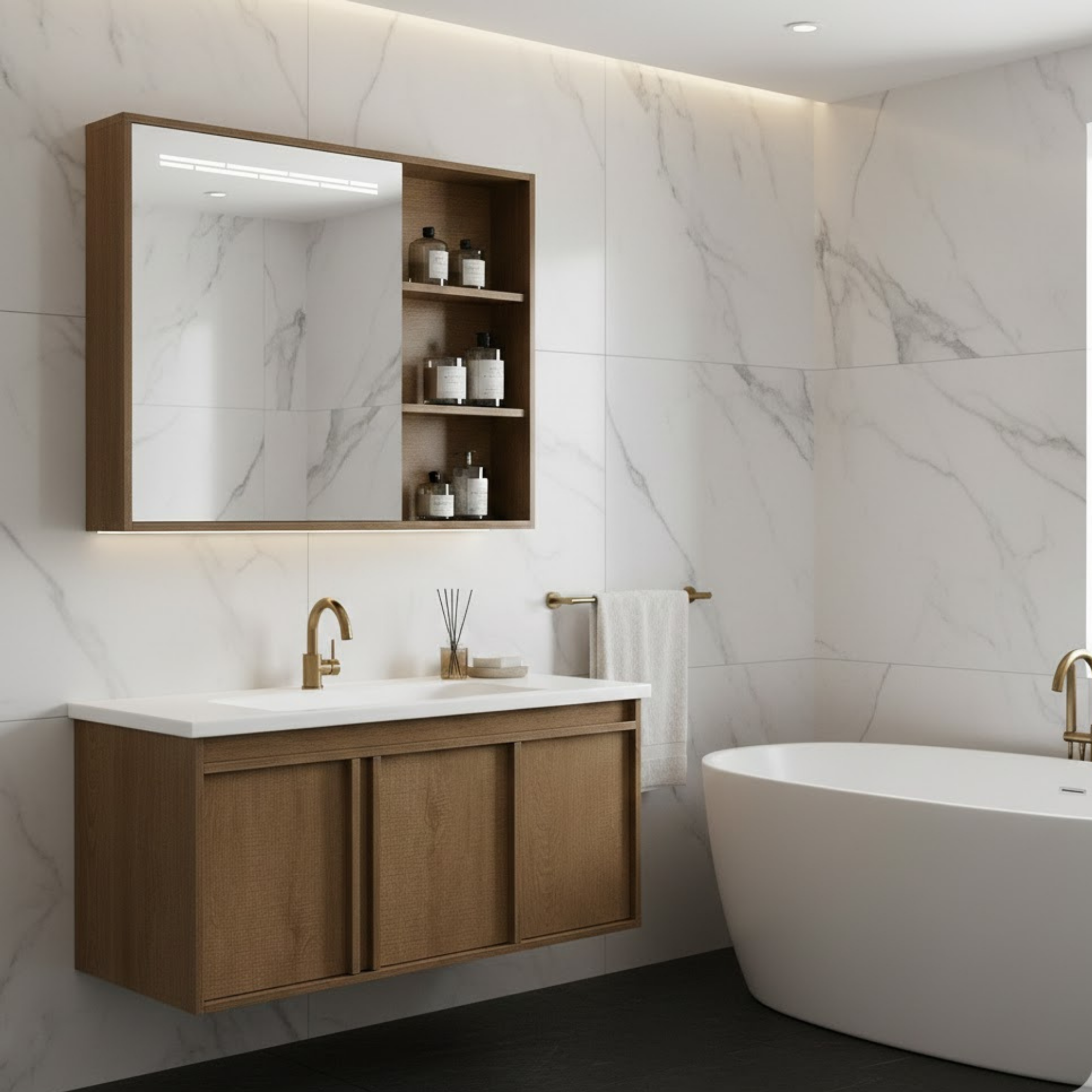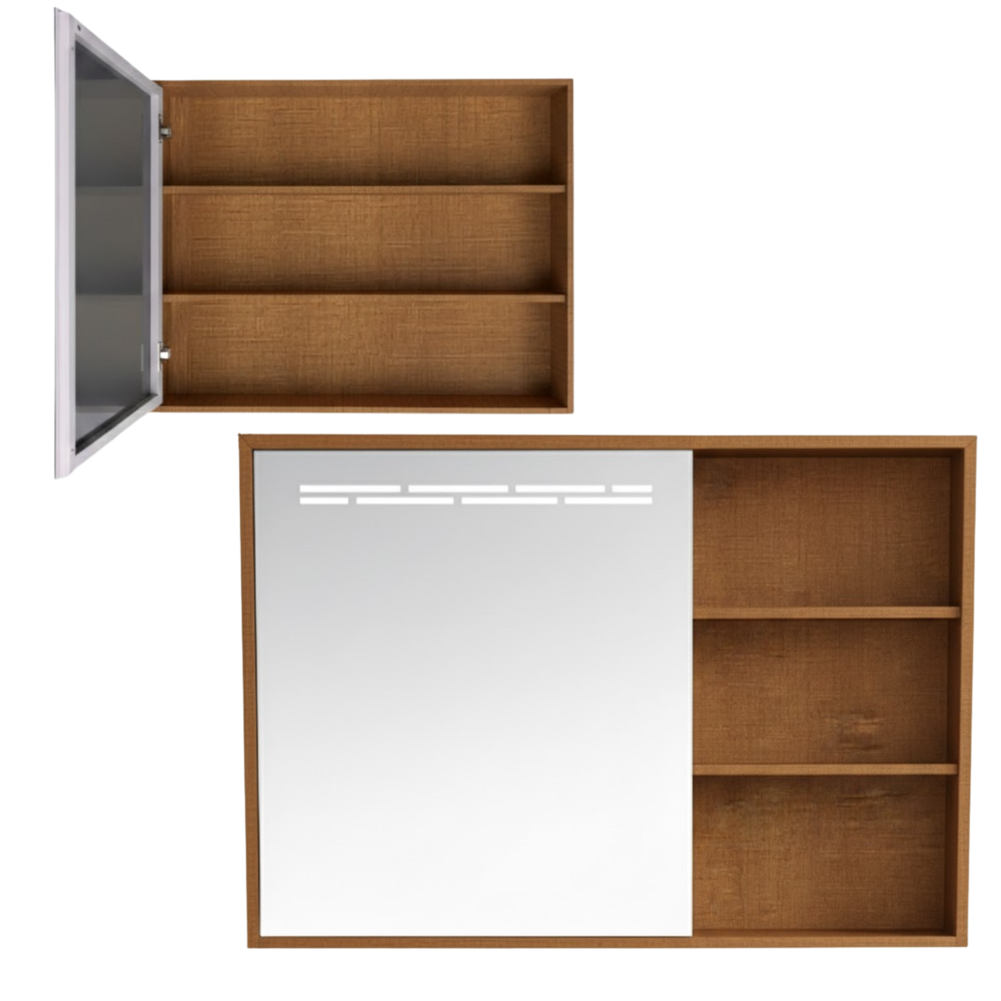 Funkcjonalna szafka łazienkowa z lustrem i zintegrowanym oświetleniem LED, zaprojektowana z myślą o wygodzie i estetyce. Szafka otwiera się i posiada 3 pojemne półki, idealne do przechowywania kosmetyków i akcesoriów.