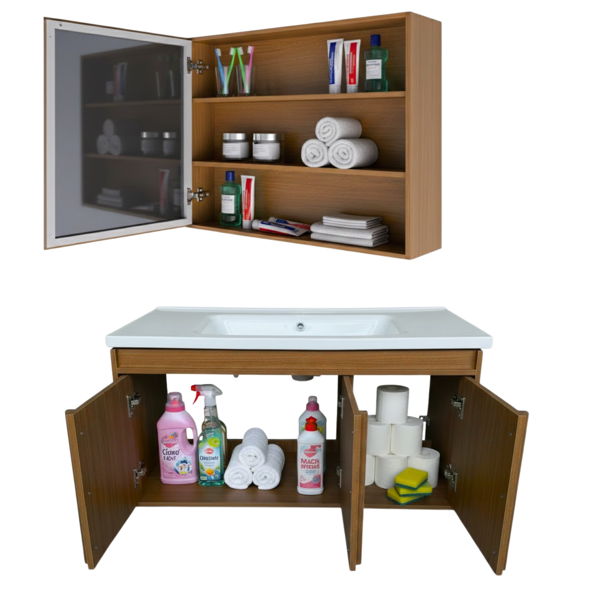 Wewnętrzne półki szafek, oferują dużo miejsca do przechowywania kosmetyków, środków higienicznych i akcesoriów łazienkowych. Funkcjonalny układ wnętrza ułatwia organizację i wygodny dostęp do wszystkiego, co potrzebne na co dzień.