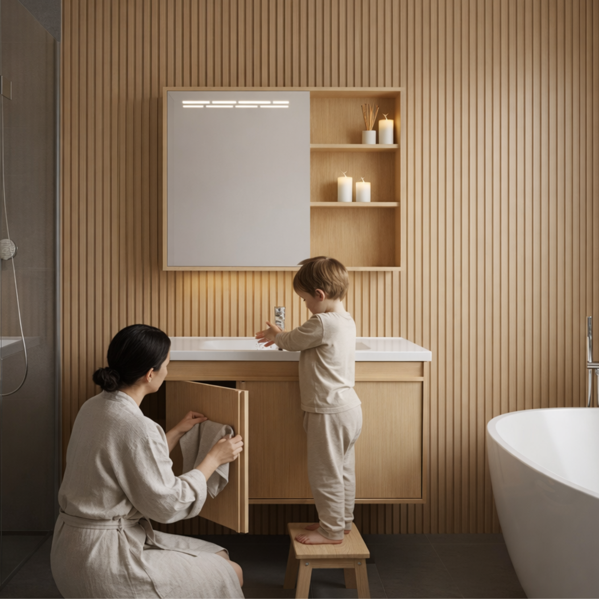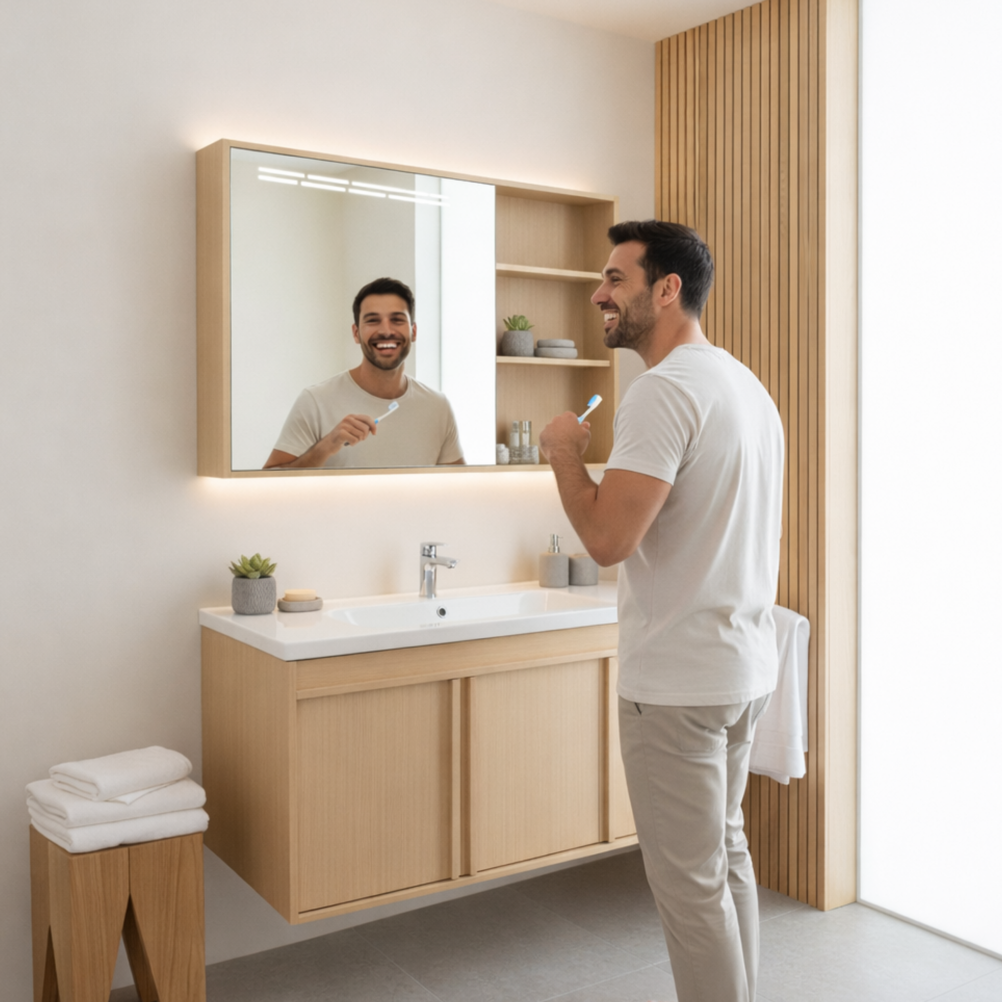 Wbudowane światło LED buduje przyjemny nastrój w łazience i zapewnia idealne warunki do codziennej pielęgnacji skóry. Praktyczne rozwiązanie, które łączy estetykę z komfortem użytkowania.