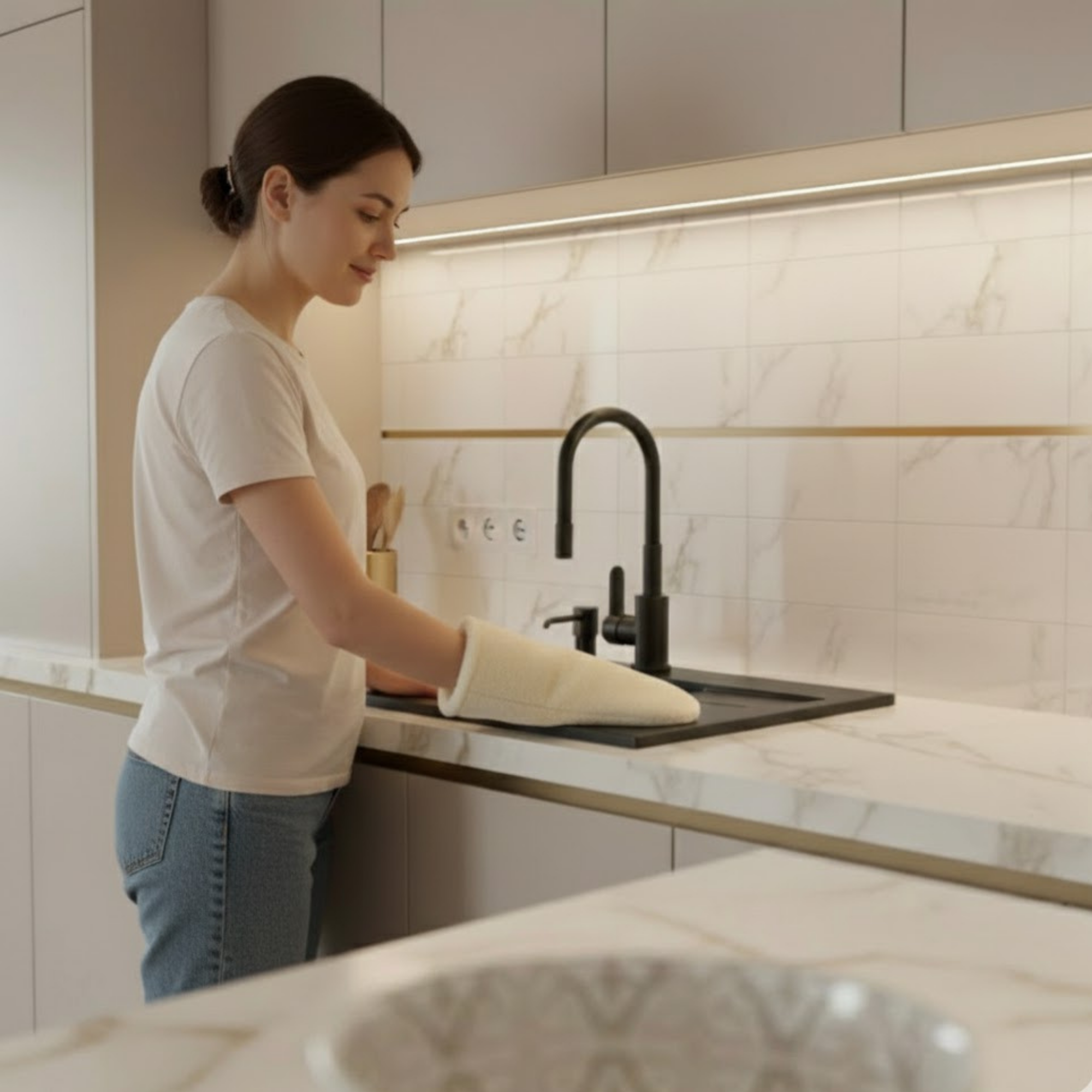 W skład zestawu wchodzi Biała Rękawica M do czyszczenia dużych, odpornych na wodę powierzchni (okna, lustra, blaty, kabiny prysznicowe) oraz Mini Czyścik Biały, idealny do precyzyjnych zadań, takich jak mycie naczyń czy czyszczenie zlewozmywaków i baterii.