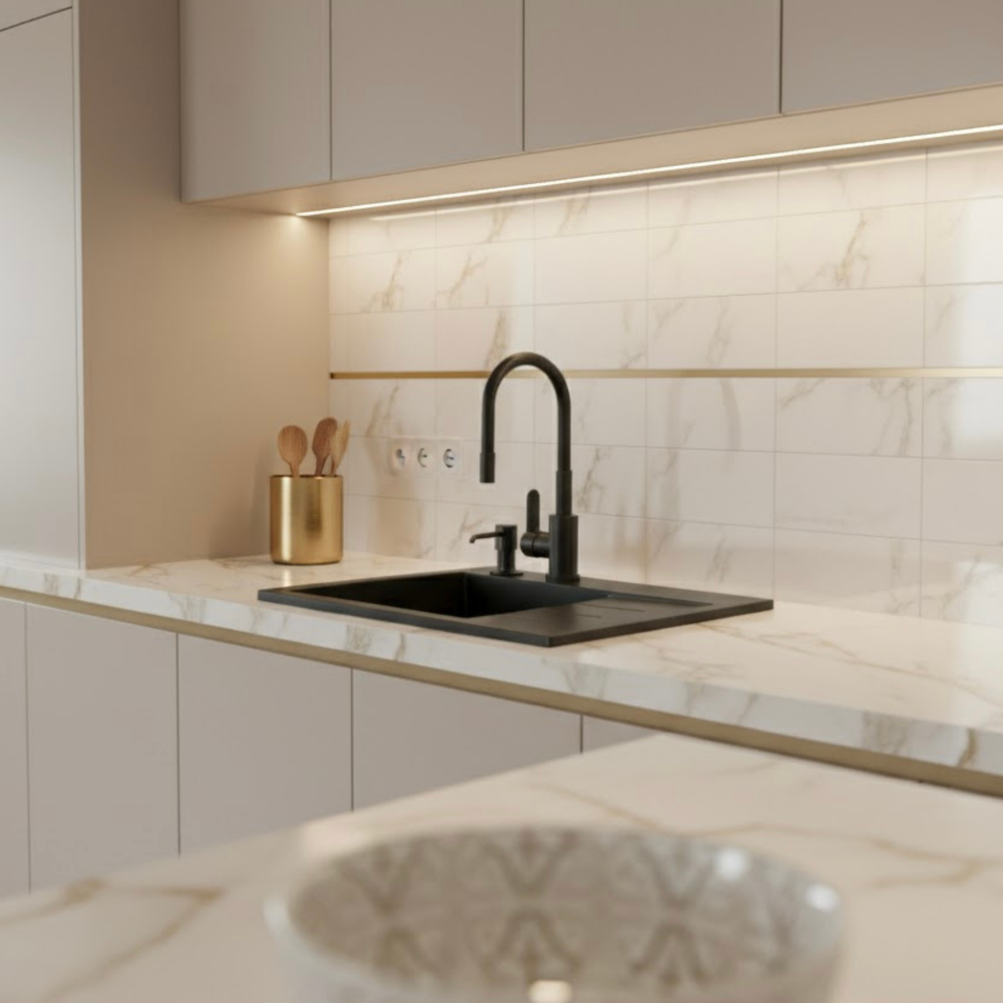 ✨ Oszczędność miejsca w szafce pod zlewem – syfon montowany jest blisko ściany – nie zajmuje przestrzeni bezpośrednio pod komorami zlewu.