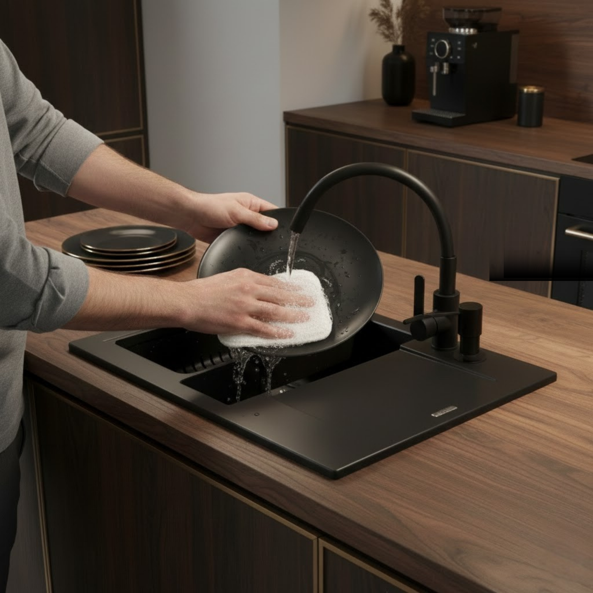 Zestaw ze Zlewem Bello to doskonały wybór do domu. Wyróżnia się eleganckim, ponadczasowym designem, a jednocześnie wysoką trwałością i odpornością na uszkodzenia. Co ważne, w zestawie znajduje się wszystko, czego potrzebujesz – nie musisz martwić się o dokupowanie akcesoriów do zlewozmywaka. Oprócz zlewu w komplecie otrzymujesz również rękawicę do czyszczenia Raypath oraz mały czyścik, które ułatwią codzienną pielęgnację i pomogą utrzymać zlew w idealnej czystości.